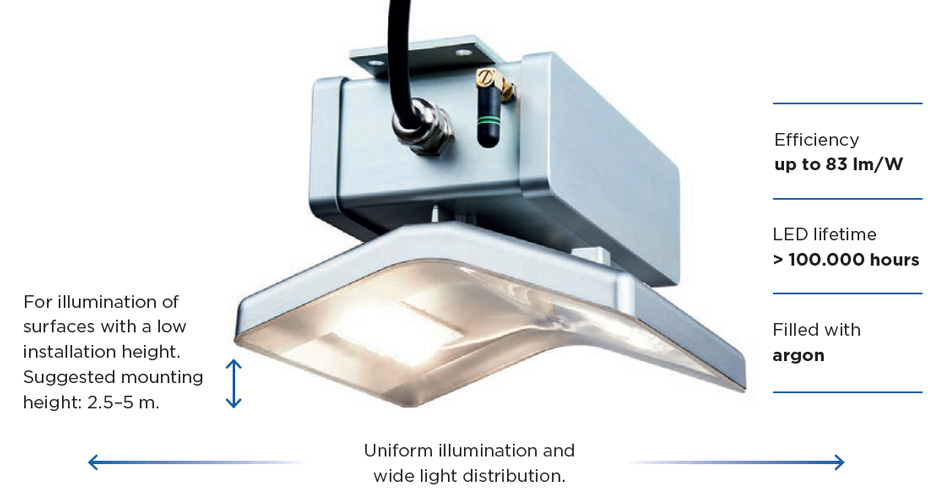 The additional, special filling of the light housing with inert gas (argon) prevents condensation inside, and therefore a longer life of the LEDs can be guaranteed. The SLC core chip is integrated into the “CCG” light. This allows the user to read out the energy data and to dim 0-100%. The wireless data transmission provides the convenience of a simple operation for various application settings and presettings. The “CCG Smart” is also available with optional motion sensors.
