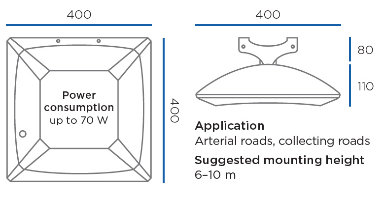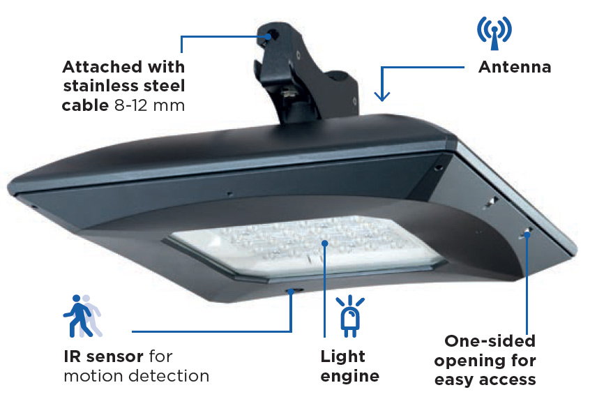 This durable and high performance LED luminaire is a great street lighting solution made for central suspension with stainless steel cable attachments. With built-in IR or microwave sensor for motion detection this luminaire enhances city safety and supports energy savings.