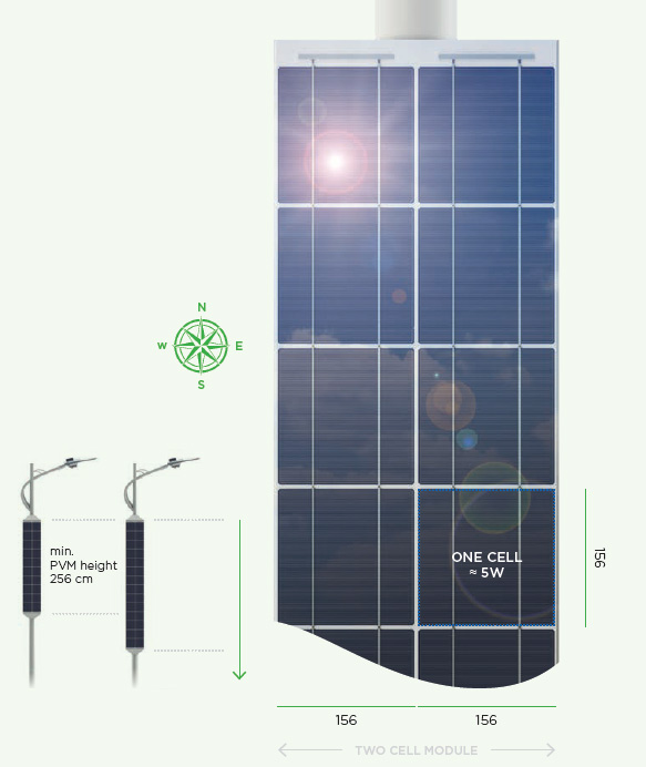 - VERTICALLY MOUNTED PV modules for easy cleaning and highest stability.