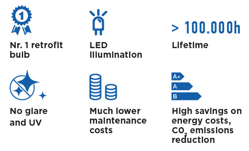 The ECCLESIA LUX retrofit bulb is a special development for high ceiling buildings, originally designed for churches and cathedrals aiming to illuminate inside their sacral buildings. It can convert existing lighting systems with improved technology and keep historic antique fixtures unchanged at the same time. Small but powerful unit, it will deliver up to 5.000 lumen and will give light designers or individual users a great variety of design options.